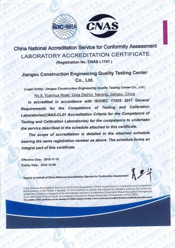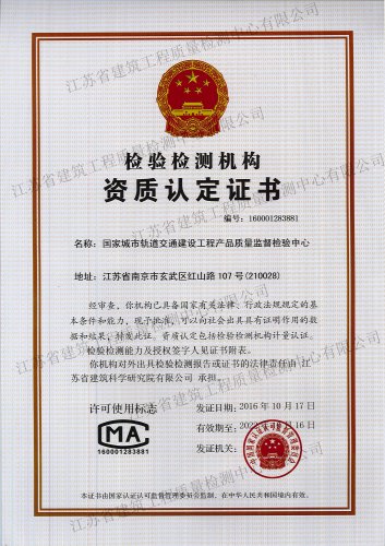 國家城市軌道交通建設(shè)工程產(chǎn)品質(zhì)量監(jiān)督檢驗中心, 依托江蘇省建筑科學(xué)研究院和江蘇省建筑工程質(zhì)量檢測中心在城市軌道交通建設(shè)工程領(lǐng)域的綜合技術(shù)優(yōu)勢,于2016年10月獲得國家認證認可監(jiān)督委員會批準授權(quán)..